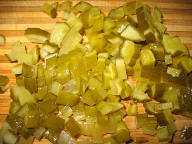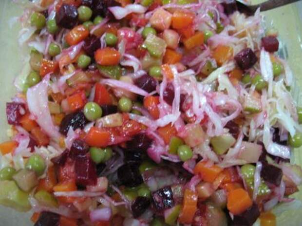 Совет: чтобы Ваш винегрет был цветным нужно первым делать нарезать свеклу кубиками и заправить ее небольшим количеством масла. Таким образом свекла не будет окрашивать остальные ингредиенты.