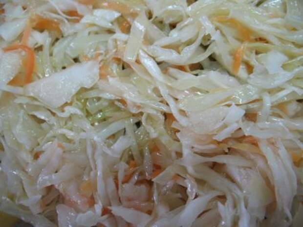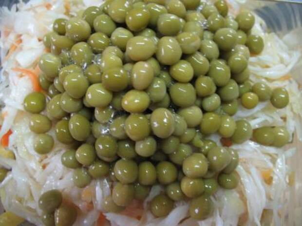 Добавляем квашеную или маринованную капусту и зеленый горошек (не забудьте слить из баночки жидкость)
