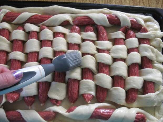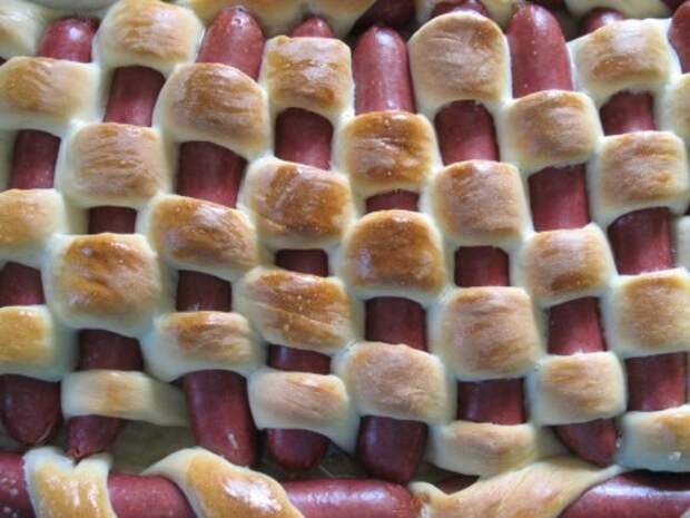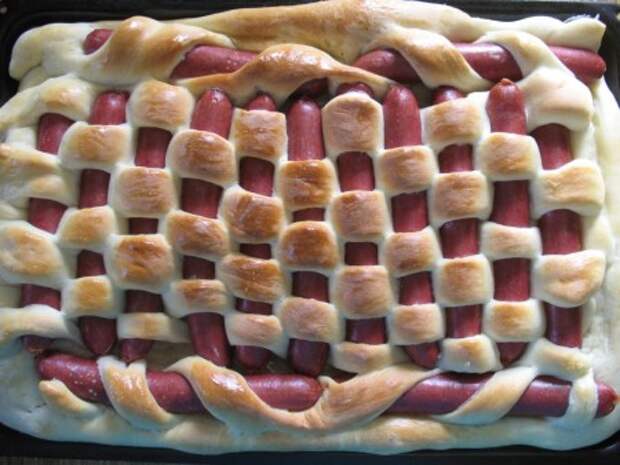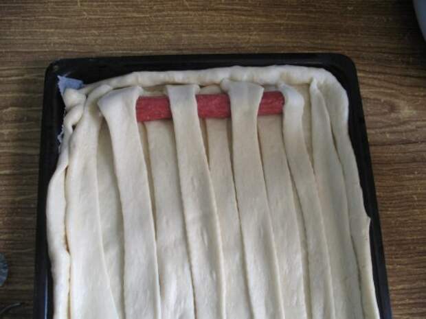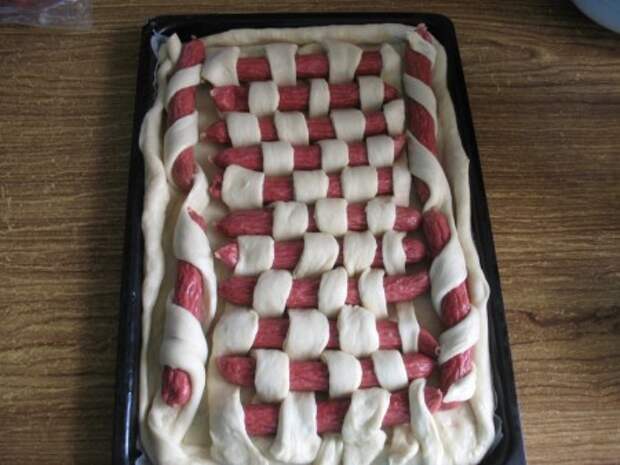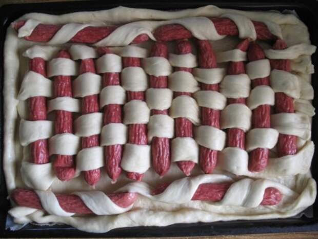 Далее в шахматном порядке «вплетаем» колбаски в пирог. Так как у меня еще по бокам место осталось, я туда положила колбаски обернутые в полоски из теста по спирали. Получился у меня вот такой пирог