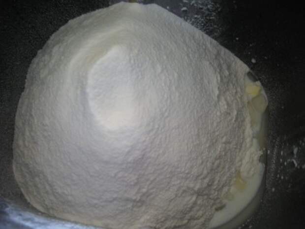 Растительное масло, просеянную муку, дрожжи, соль и сахар. Включаем хлебопечку на режим «Тесто» и ждем 1,5 часа пока подойдет тесто